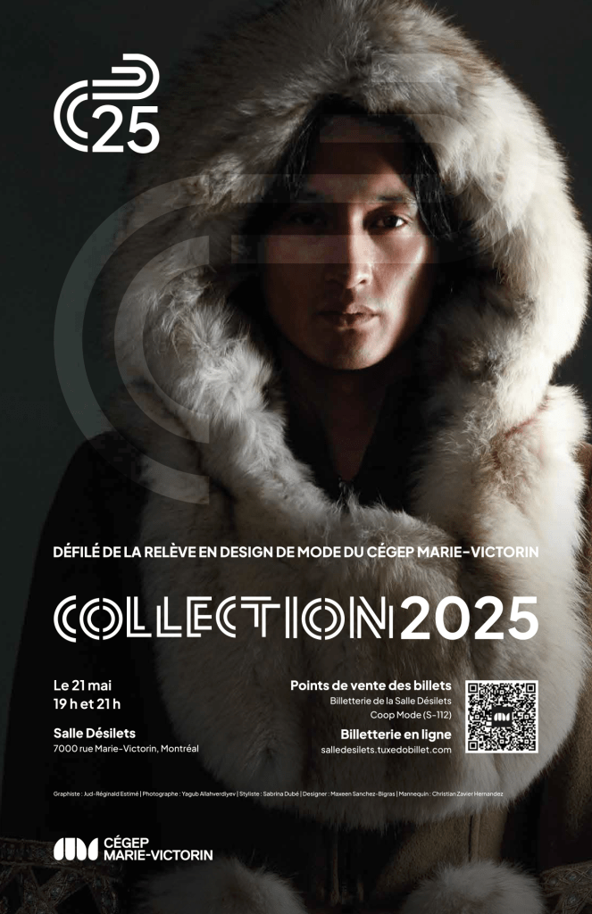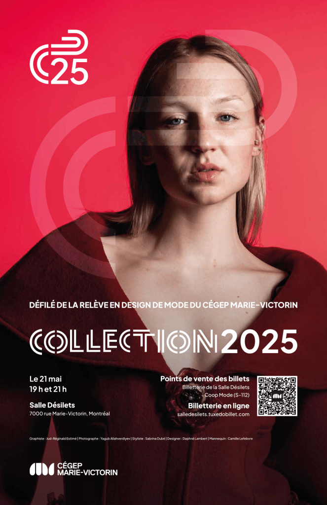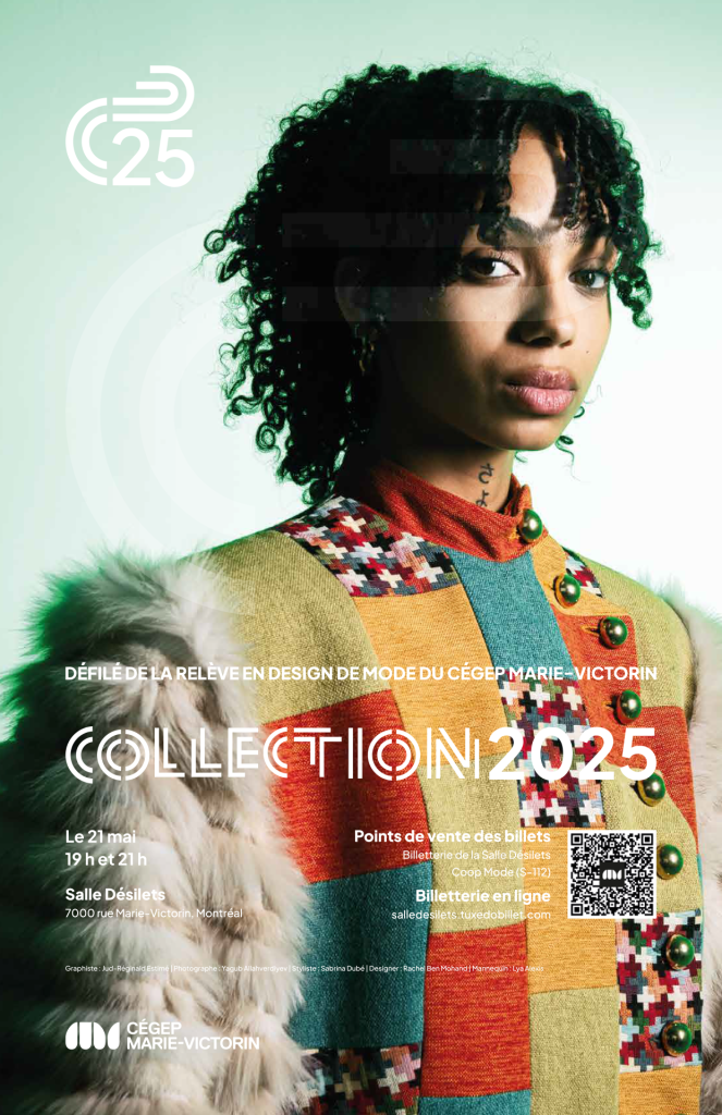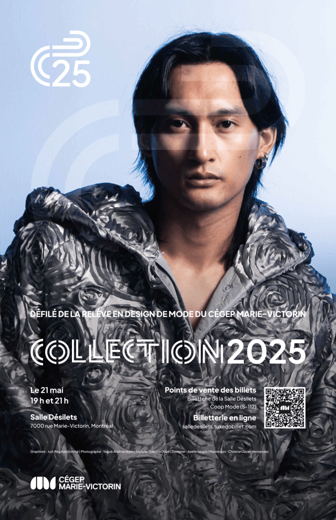 Pour souligner la diversité des talents en Design de mode du Cégep Marie-Victorin, le visuel du défilé COLLECTION 2025 se décline cette année en huit variations d’affiches, chacune mettant en lumière l’univers créatif de huit designers de la relève.